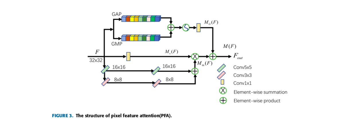 - pixel feature attention module: the multi-scale convolution kernel is employed to generate the feature map of the same size as the input
