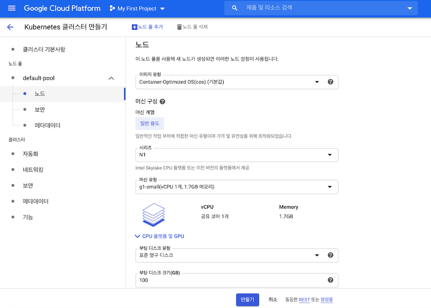 노드의 경우 머신 유형을 가장 낮은 스펙으로 선택합니다. (g1-small)