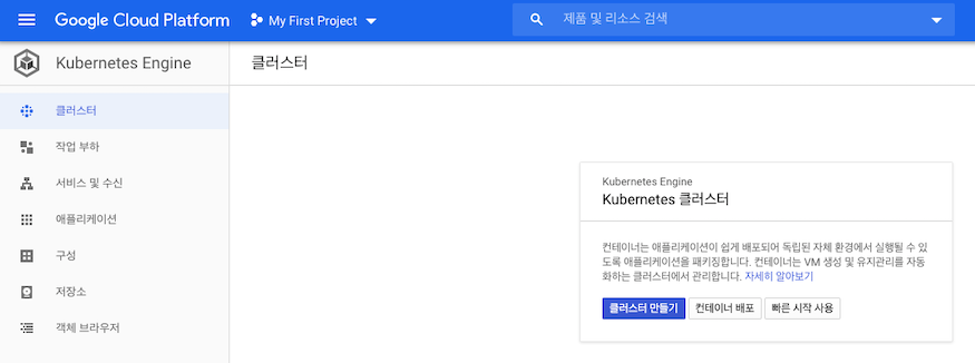 구글 클라우드 콘솔에 접속 후 다음과 같이 쿠버네티스 엔진으로 이동하여 클러스터를 생성합니다. 존(Zone)의 경우 asia-northeast3-a로 지정하였습니다. asia-northeast3의 경우 최근에 생긴 서울 리전입니다. 나머지는 모두 기본값으로 설정합니다.