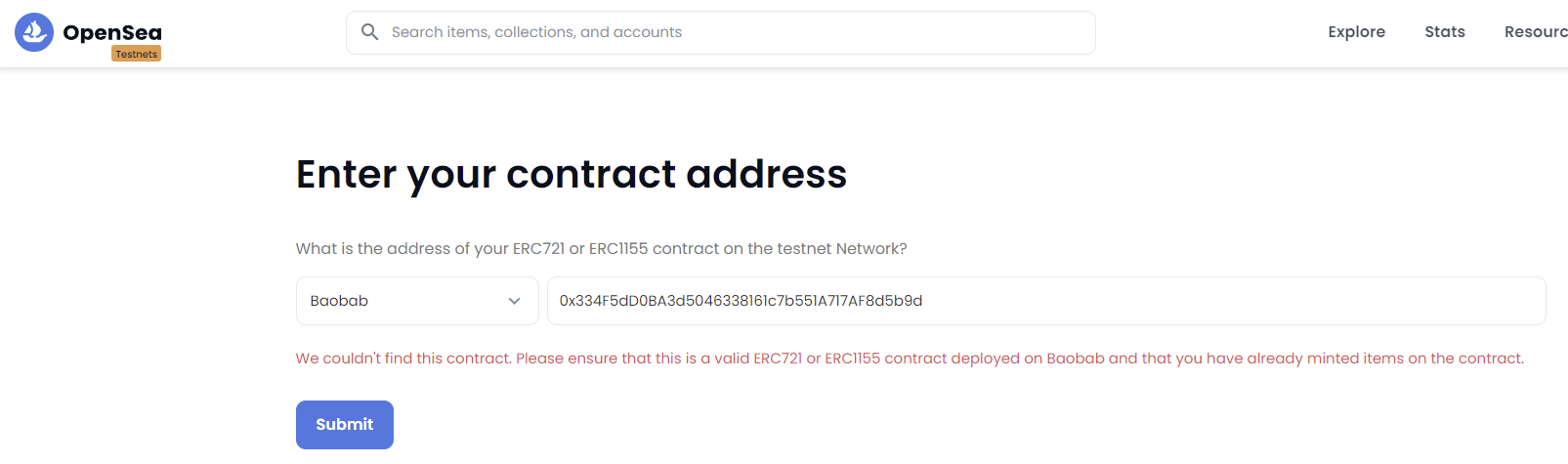 3. KIP-17 컨트랙트를 배포후, 토큰 1개를 민팅한다. 만약 민팅하지 않고 임포트를 수행하면 아래처럼 오류가 발생합니다.
